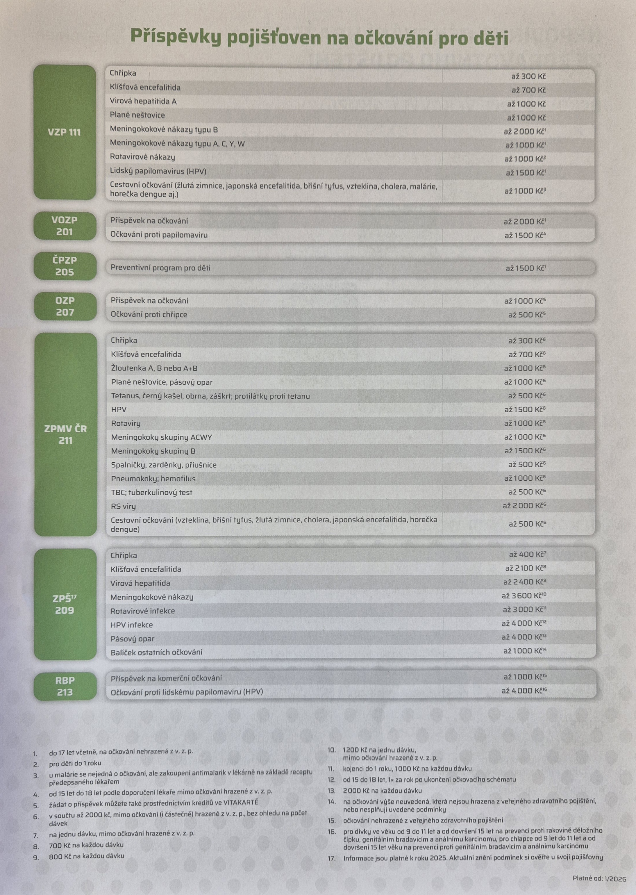 - od 1.1.2026 je možné čerpat prostředky z fondů prevence jednotlivých zdrav. pojišťoven. Vyzdvihujeme pojišťovnu VZP (srovnání příspěvků ZP na očkování, brožura výhod VZP) a její široké spektrum výhod a příspěvků (očkování, kojenecké plavání, mimoškolní ale i na školní pohybové aktivity, ...). VZP nabídka pro rok 2026 zde